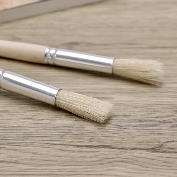 De kwast heeft een houten steel en een zorgvuldig samengestelde mix van natuurlijk en synthetisch haar: soepel voor zachte overgangen, stevig voor gecontroleerd lijnwerk.