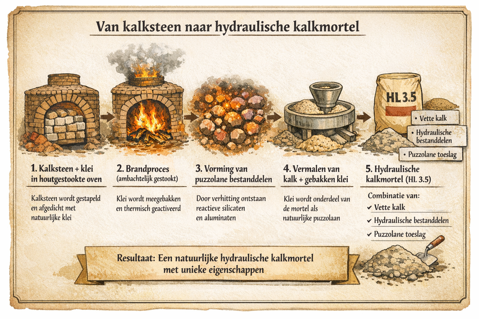 👉 Hierdoor ontstaat een natuurlijke hydraulische kalkmortel.
